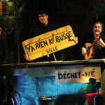 Sur scène, tout est construit à partir de ce que l’on jette : boîtes de conserves, briques de lait, bouts de bois, vieilles casseroles, jouets, et autres objets glanés parmi les déchets et dans les vides greniers. En fabriquant des marionnettes et autres bizarrerie instrumentales, trois comédiens (Valérie Ancel, Denise Laborde et Jean-Philippe Ibos) redonnent vie à ce joyeux bric à brac et inventent des silhouettes amusantes, des animaux étranges. Pour un joyeux recyclage de nos vieilles habitudes usagées…